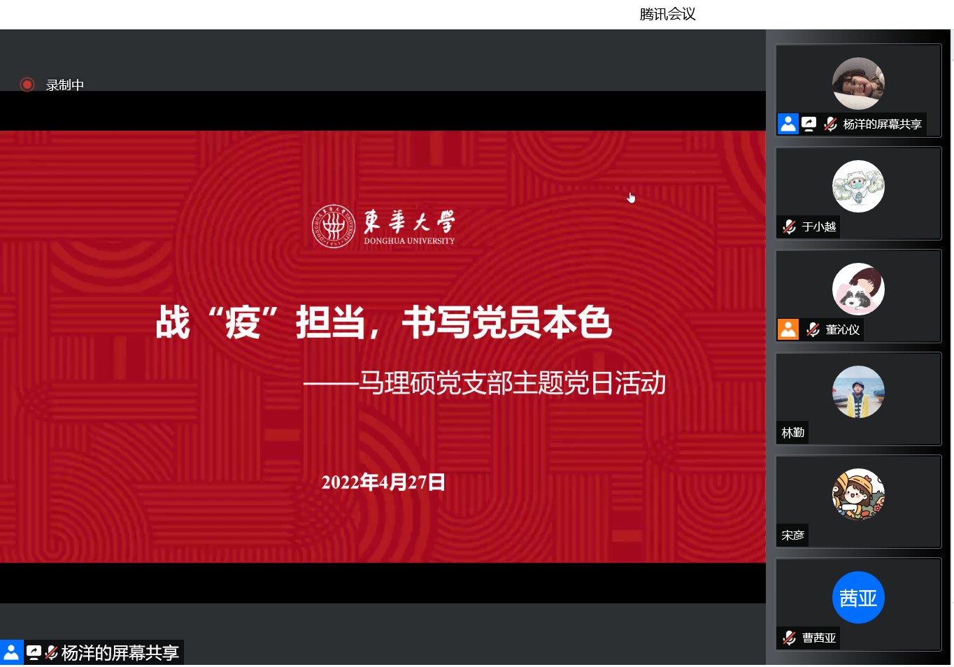 2022年4月27日下午,beat365官方网站马理硕党支部开展了战疫担当,书写党员本色,争做堪当民族复兴重任的时代新人——学习习近平总书记在中国人民大学考察时的重要讲话精神主题党日活动。学院党委书记戴叶萍老师、辅导员于小越老师和马理硕党支部全体党员、积极分子参加。本次活动由马理硕党支部书记杨洋主持。 本次主题党日活动首先由支部组织委员刘浩霆领学习近平总书记在中国人民大学考察时的重要讲话精神,他在学习交流中表示作为马克思主义理论专业的党员和入党积极分子,应时刻牢记习近平总书记对广大青年提出的殷切希望,牢记党的教诲,立志民族复兴,不负韶华,不负时代,不负人民,努力成长为堪当民族复兴重任的时代新人。 结合学习交流,活动由在疫情防控中担任驻楼辅导员和楼层长的三位同学依次分享了战“疫”体会。松江校区14号楼驻楼辅导员苏魏从让每个学生都有自己的归属地、让学生的归属地更有安全感、更加有保障以及让学生的归属地更加人性化三方面交流了自己切实担起防疫责任的深刻体会。6号楼楼长罗海旗谈了作为楼长每天配合驻楼辅导员、宿管阿姨落实好各项防疫措施,保障同学们身体健康和有序平稳生活的工作感悟。3号楼5层层长纪沛彤在交流中表示在工作中时刻感受到的是责任与温暖,责任来源于每天根据安排及时组织本层同学落实落细各项防疫要求任务,温暖来源于同学们积极配合和投身于防疫志愿者工作所迸发出的蓬勃青春力量。 党支部书记杨洋在主持会议时,号召支部党员,要亮身份、见行动,积极发挥党员先锋模范作用,主动担当,联系服务群众,带头和配合落实好学校各项防疫要求,积极为打赢疫情防控攻坚战作贡献。 辅导员于小越老师对支部党员和入党积极分子提出要求,强调要进一步发挥党员先锋模范作用,继续坚持和坚守,严格遵守目前学校疫情防控的各项要求,为坚守好学校来之不易的抗疫成果作出积极努力。 学院党委书记戴叶萍老师在总结讲话中指出,大家要认真学习贯彻习近平总书记重要讲话精神,坚决做社会主义核心价值观的坚定信仰者、积极传播者、模范践行者,要坚定不移听党话、跟党走,朝着成长为堪当民族复兴重任的时代新人的目标不懈努力奋斗。尤其在当前疫情防控严峻形势下,每个人都要坚守好自己的防疫责任,落实好网格化管理的各项要求,希望大家坚定信心,齐心协力,共克时艰,共同奋力打赢疫情防控攻坚战。 撰写:于小越,刘浩霆 |