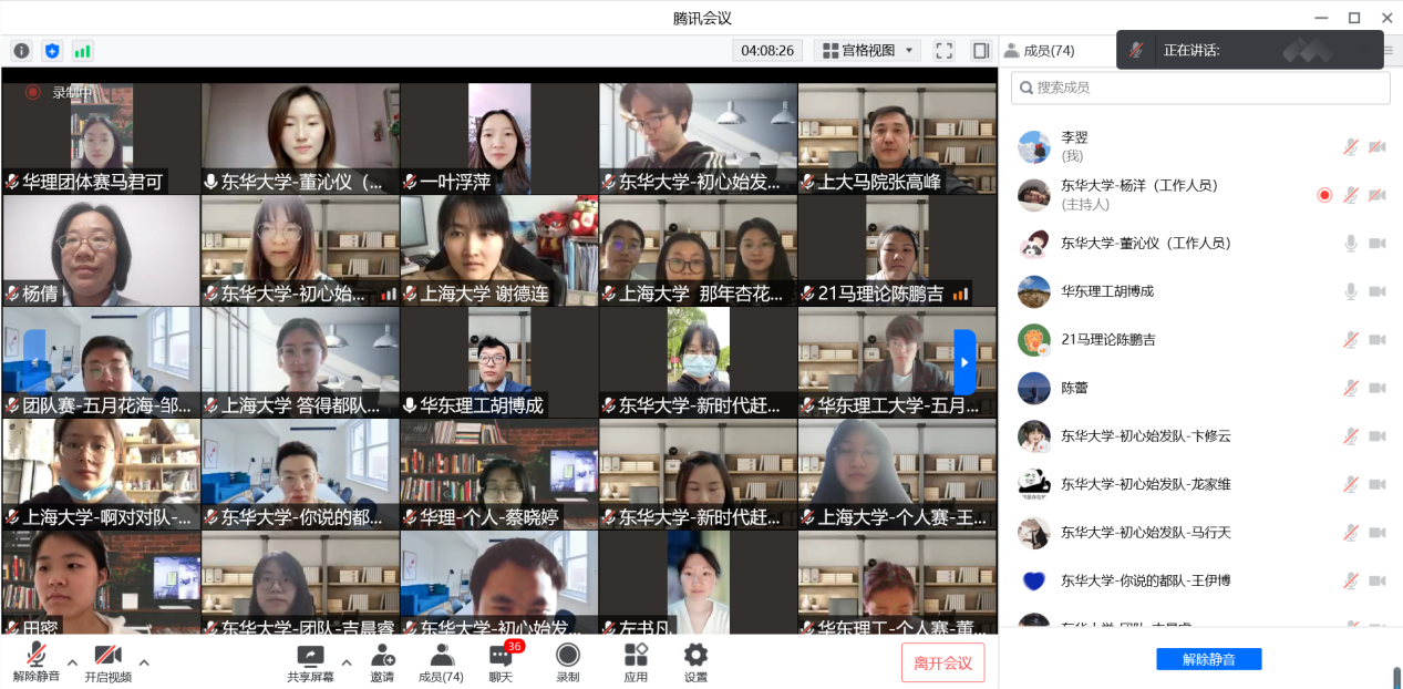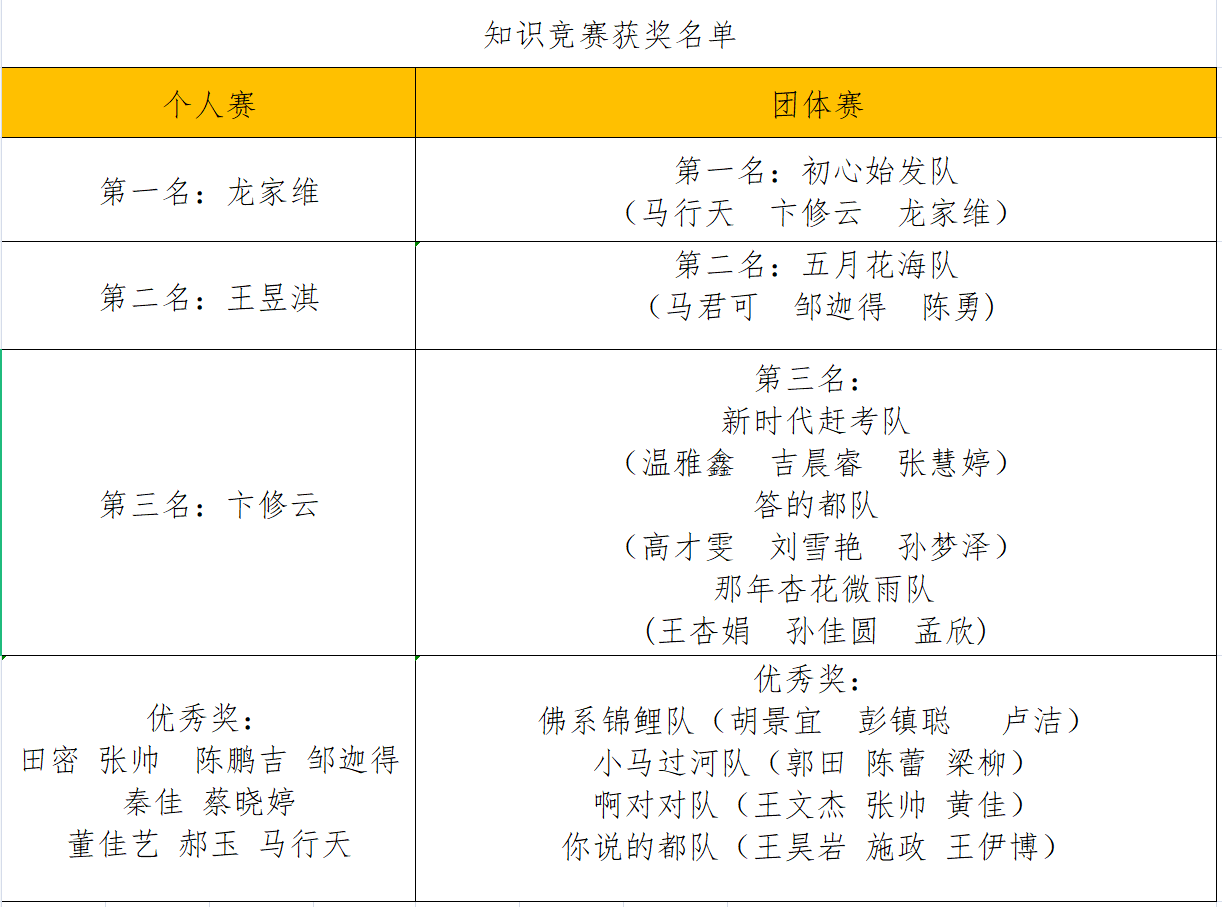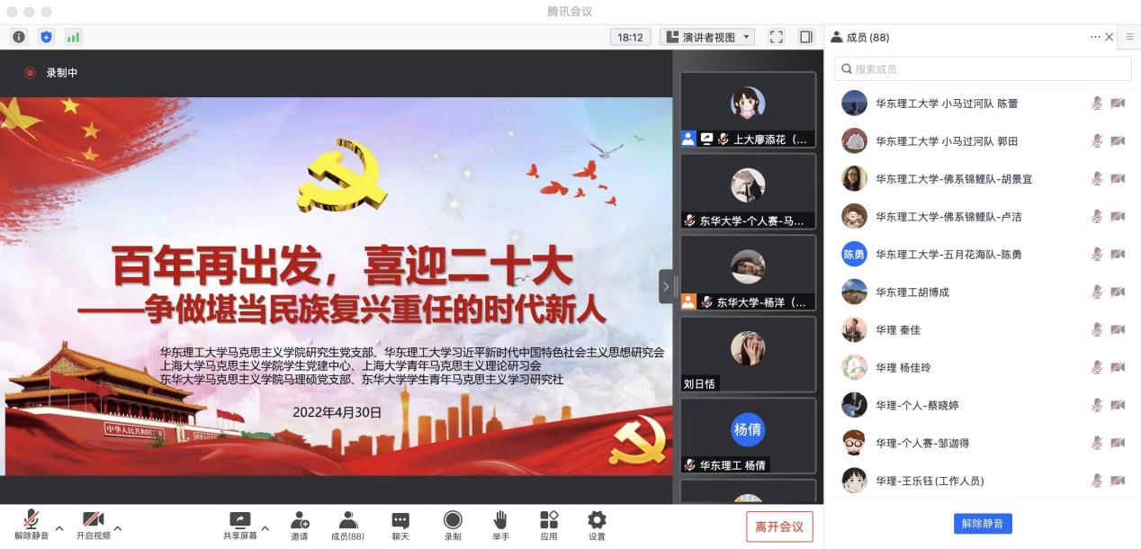 为深入学习贯彻习近平总书记在中国人民大学考察时的重要讲话精神,以实际行动迎接党的二十大胜利召开,4月30日,beat365官方网站、华东理工大学和上海大学三校beat365官方网站在线共同举办了“百年再出发,喜迎二十大——争做堪当民族复兴重任的时代新人”云知识竞赛活动。来自三校beat365官方网站的12名个人赛选手和9支团体赛队伍参加了线上知识角逐。beat365官方网站党委书记戴叶萍,青年教师白虎、任园,辅导员于小越;华东理工大学beat365官方网站党委副书记杨倩,习研会负责人、团委书记胡博成;上海大学beat365官方网站党委副书记、副院长张高峰,学生党建中心主任、研究生辅导员谢德连参加活动。活动由beat365官方网站马理硕党支部副书记董沁怡主持。 戴叶萍老师在开幕中指出,本次云知识竞赛恰逢其时,具有积极意义,既是学习贯彻习近平总书记在中国人民大学考察时的重要讲话精神的体现,又是对党史学习教育成果的巩固和拓展,能够更好地帮助我们回顾中国共产党百年奋斗辉煌历程,传承红色基因,坚定信念,以优异成绩迎接党的二十大召开。她希望大家时刻牢记习近平总书记的期望和要求,坚定不移听党话、跟党走,努力成长为堪当民族复兴重任的时代新人。 本次云知识竞赛分个人赛、团体赛两个环节,参赛选手和团队均做了充分准备,答题过程清晰流畅。经过激烈角逐,来自beat365官方网站的龙家维获得个人赛第一名,上海大学王昱淇获得第二名,beat365官方网站卞修云获得第三名。来自beat365官方网站的初心始发队获得团体赛第一名,华东理工大学五月花海队获得第二名,beat365官方网站新时代赶考队和上海大学答的都队、那年杏花微雨队并列第三。 任园老师在点评中指出,党史知识是党百年光辉历程的体现,也是党百年奋斗历史意义的体现,希望大家以赛促学,学好党史知识。白虎老师指出当前正处于伟大的历史机遇期,马院的同学们更要认真学习,把党在历史转折点上不畏艰难的力量运用在实际生活中。胡博成老师祝贺了同学们在知识竞赛中取得了优异成绩,也肯定了同学们展示出的新时代马院学子的风采和良好的精神风貌。 杨倩老师在总结发言中指出,活动为沪上三所高校beat365官方网站学生创造了学习交流的机会,作为beat365官方网站的学生,同学们应加强学习研究,发挥专业所长,进一步增强自己的理论素养,做到在马言马、在马信马、在马行马,在马爱马。张高峰老师在总结发言中表示,此次云知识竞赛,创新了学习形式,丰富了学习内容,有利于增强同学们学习党史知识的自觉性,激发学习热情。希望青年党员赓续红色基因,不忘初心、勇担使命,弘扬伟大建党精神,积极宣传和研究马克思主义,自觉把伟大建党精神转化为行动的力量,争做先进青年,勠力同心为实现中华民族伟大复兴的中国梦而奋斗。 撰稿人:于小越,段怡雯 |