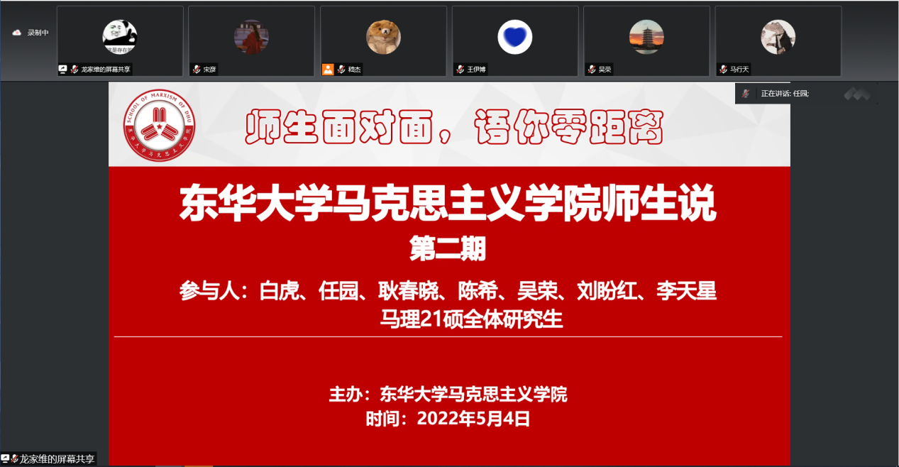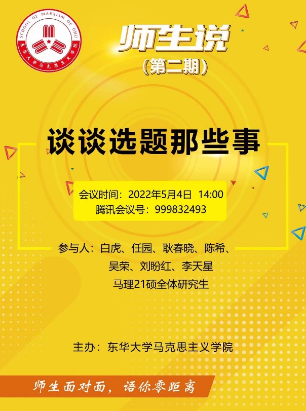 5月4日,正值五四青年节,beat365官方网站举行了“师生说”系列主题活动第二期——“聊聊选题那些事”。本期主题活动由白虎、任园、耿春晓、陈希、吴荣、刘盼红、李天星七名青年教师与马理21硕全体研究生在云端面对面、零距离共话成长。 本次主题活动以问题为导向,同学们带着自己在论文选题中遇到的实际问题,与青年教师开展学术交流。李天星老师指出学术研究要因人而异、因时而异,要找准研究领域,培养问题意识。耿春晓老师建议学术研究要深耕自己感兴趣的领域,不要盲目跟风热点,要注重对资料的编年整理,建立联系。刘盼红老师结合自己博士论文的写作经历,与同学们分享了查找资料、检索资料和整理资料的具体方法。陈希老师分享了母题--主题--子题三级形式确定选题的具体操作方法。吴荣老师与大家分享了教材式与问题式两种论文写作形式,他强调要在写作中坚持解决问题而不仅是堆砌材料。白虎老师建议同学们一是尽可以收集多的资料以支撑起自己的选题;二是明确以问题为出发点;三是兴趣入门,重在坚持。任园老师针对同学们存在无法找到问题以及无法转化为学术问题的困惑提出了应对之策,一是在理论与实践之中寻找突破点;二是建立长久的阅读习惯。 “师生说”系列主题活动于3月底策划组织开展,是beat365官方网站深化青年教师经典导读计划,推进“我为群众办实事”长效机制的一项举措,以“师生面对面,语你零距离”为导向,旨在搭建学院青年教师和青年学子沟通交流平台,以青年教师自身成长经历和学术成长道路勉励青年学子接好学术交接棒。第一期围绕“谈谈读书这件事”这一主题,七位青年教师结合自身学习科研经历,围绕着如何选书、如何读书和读书的具体方法与同学们进行了深入交流。本期主题在读书基础上进一步深化,为同学们解答了学业中的困惑,建立了学术信心。同学们深感受益匪浅,期待“师生说”系列主题活动能够促进学院师生碰撞出更多思想火花。 撰稿:于小越,宋彦 |