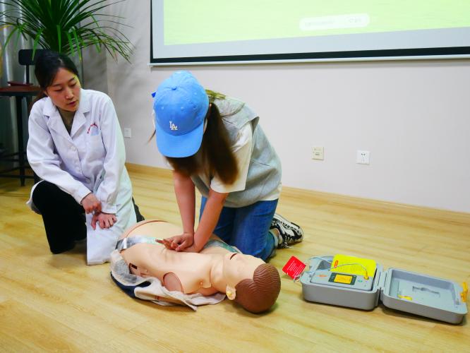 “同学们试想一下,你作为发现待救治患者时,应该怎样与其他人配合拨打120?”“假如我们遇到的伤者戴着假牙,我们在做心肺复苏前应当怎么做呢?”包蓉珠老师立足高校学子的急救知识储备情况及教学预期,创设多个情境,增强学生互动体验感。配合具体的情境,包老师系统地介绍了红十字运动的基本知识、现场救护的基本流程和注意事项,并讲解了CPR的操作方法和AED的使用方法等。除了详细剖析急救知识外,她特别提醒同学们要在救护过程中要注意自身安全,避免二次伤害。