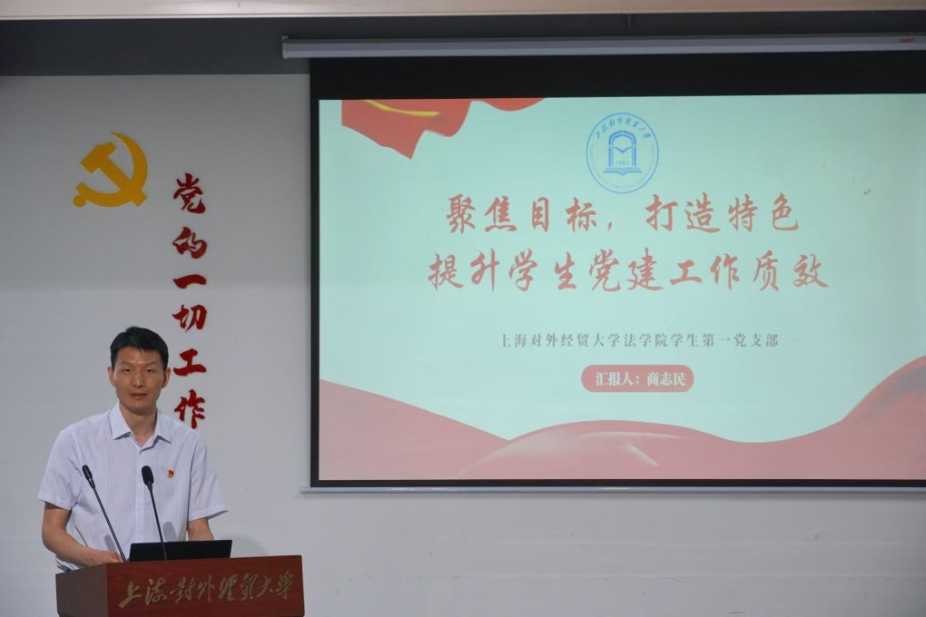 上海对外经贸大学法学院党委副书记、学生一支部书记商志民以“聚焦目标,打造特色——提升学生党建工作质效”为题介绍了支部基本情况、重点工作和特色做法。并分享了支部在“党建+思政”、法治宣传活动、区域化党建等方面的经验。他总结,通过政治引领、融合专业、作用发挥三个方面来谋篇布局,推动支部工作打开新的局面。